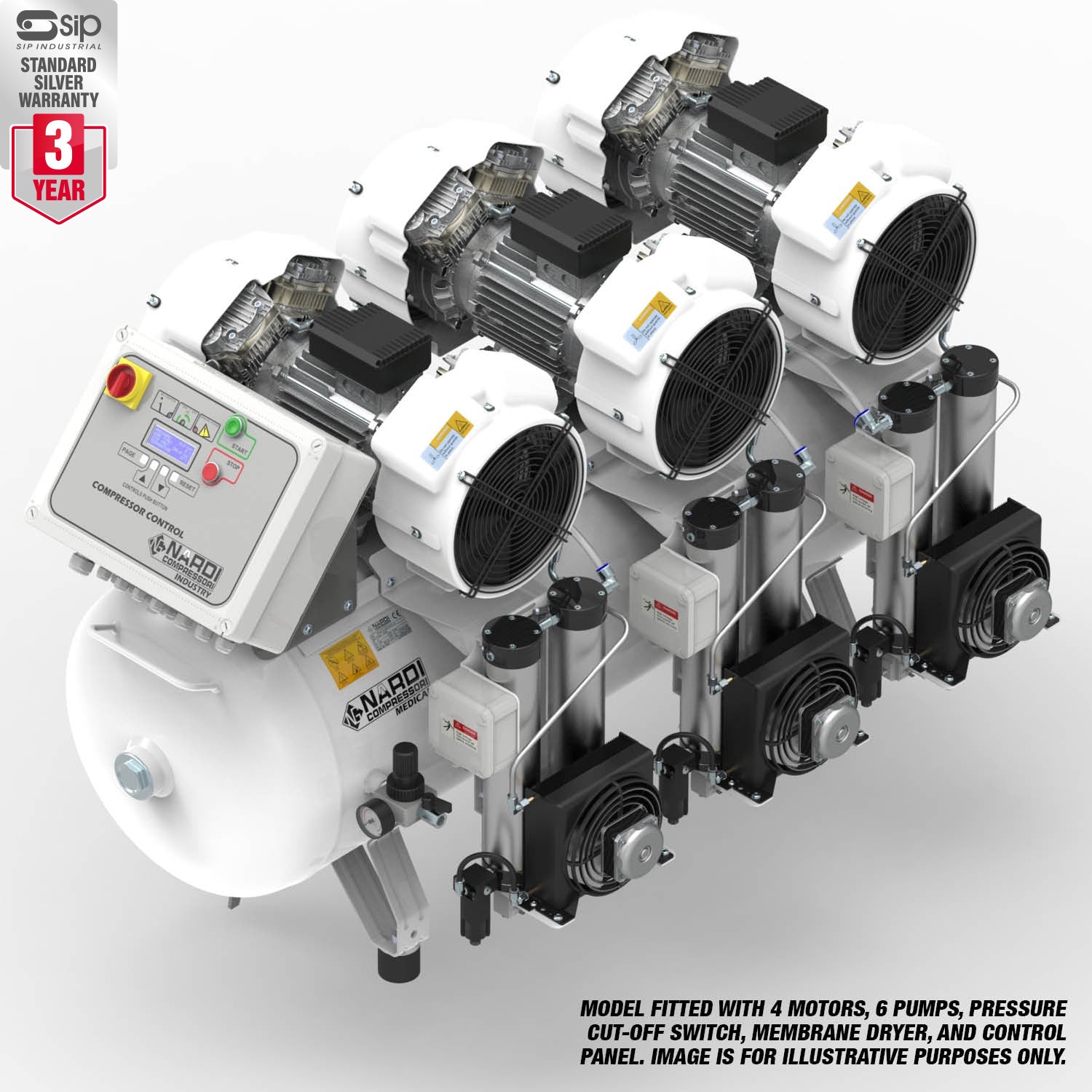 The NARDI EXTREME MPMD 9.00HP 270ltr Direct Drive Dental Compressor with Panel offers heavy-duty performance perfect for demanding applications, delivering powerful piston displacement via a slow-running motor and high-quality oil-free pump.