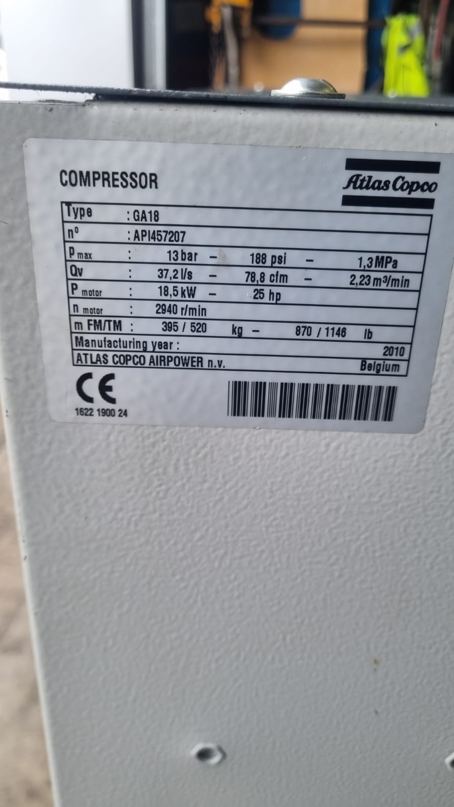 - Complete Atlas Copco major service kit fitted (belts, filters, separator, oil)