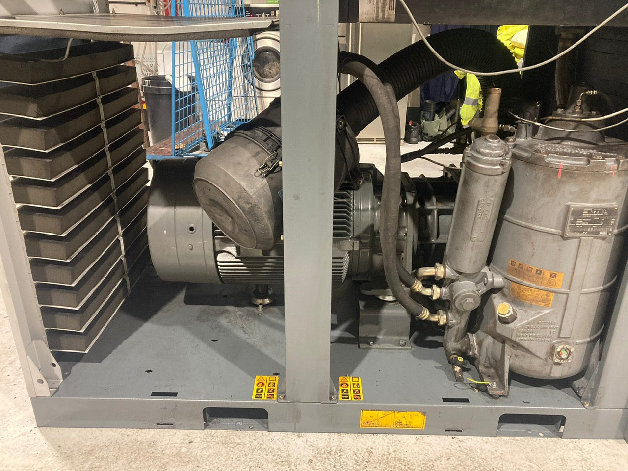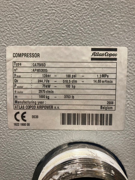 High-pressure energy-saving powerhouse: this Atlas Copco GA75 VSD variable speed model is configured for demanding 13 bar applications such as PET bottle blowing, high-pressure testing, laser/plasma cutting or industrial process air.