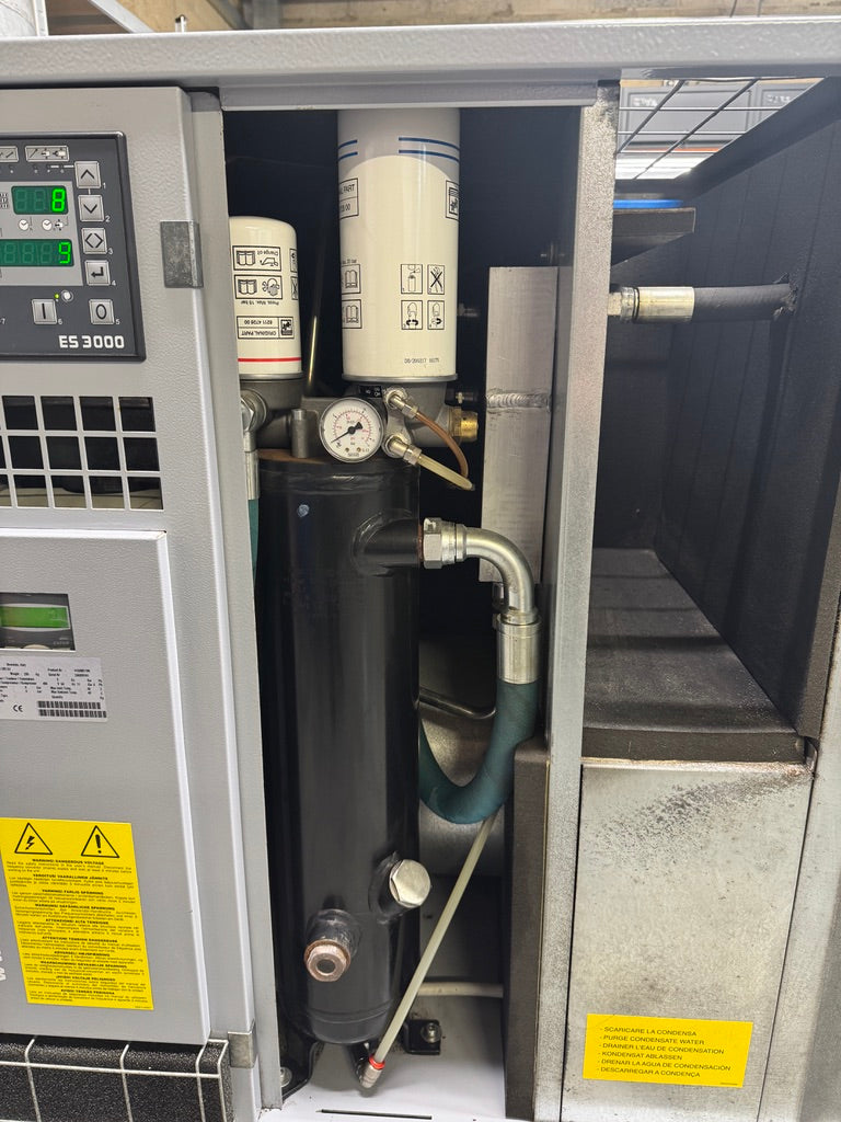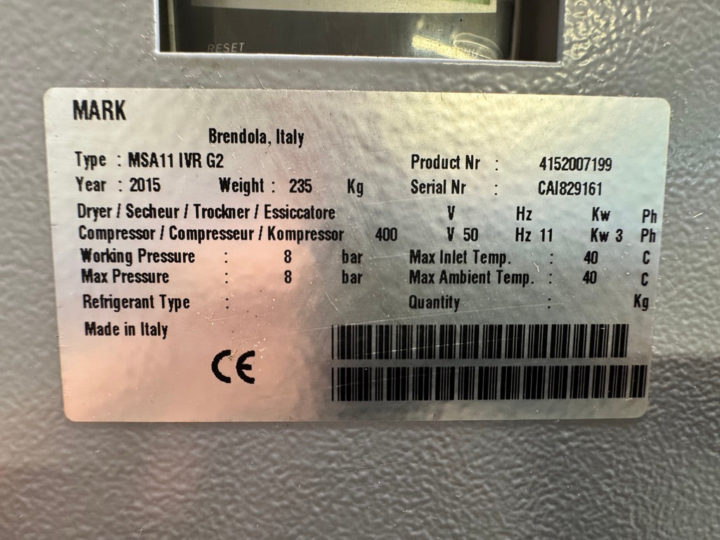 Energy-efficient variable speed base unit with filtration and external receiver: this MARK MSA 11 IVR (Inverter Variable Regulation) belt-driven rotary screw compressor automatically adjusts speed to match air demand, providing excellent energy savings (up to 30-35% vs fixed-speed), soft starts, and consistent performance.