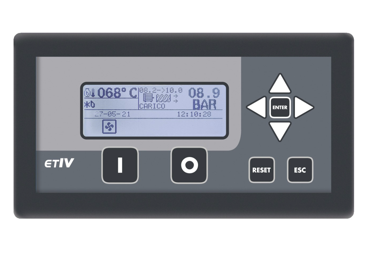 - Backlit LCD shows operating pressure values, oil temperature, compressor status, fan status, time and date maintenance hours, total and working hours